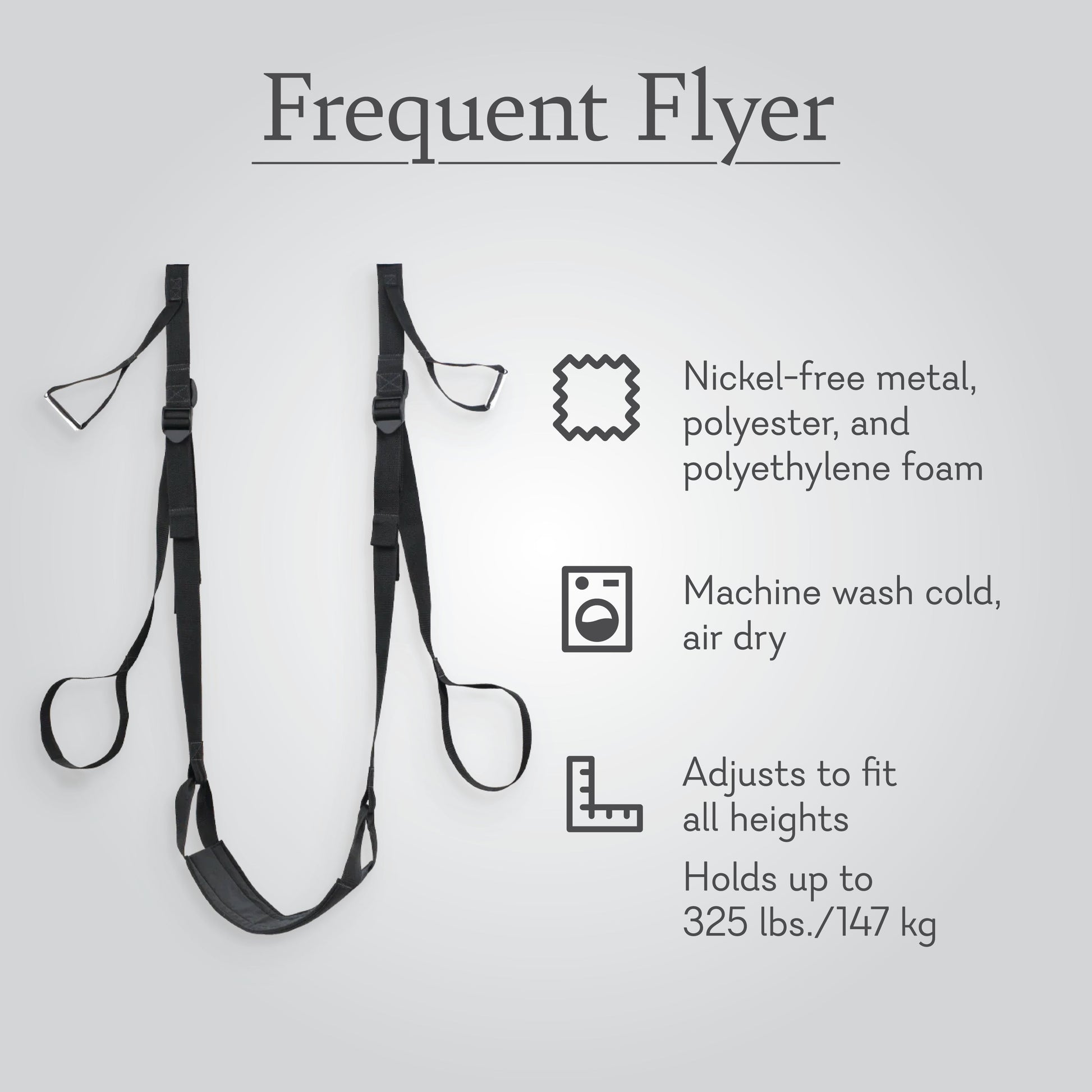 Welcome aboard your non-stop flight to paradise. The Frequent Flyer Door Swing fits in any doorframe for bedroom acrobatics that'll take partner play up to a whole new level. Have a seat, position the straps, and you're ready for take-off. Move in ways you never imagined or ask your co-pilot to take hold of the seat to angle your hips for ultimate satisfaction. Your Mile-High Club membership awaits.