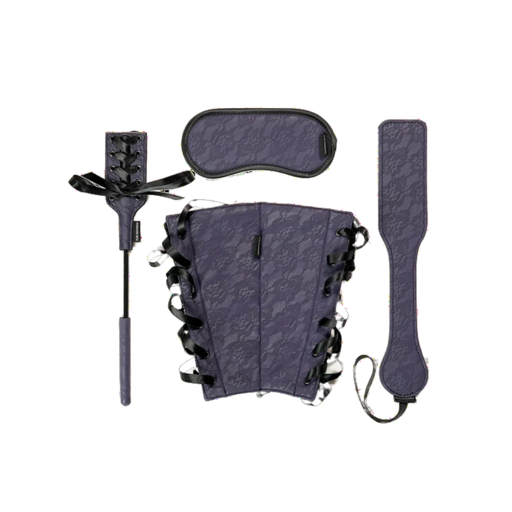 Delve into a whole new world with a luxe, four-part set featuring a blindfold, paddle, crop, and arm restraints. The paddle and crop take painful pleasure experiments to mastery, the blindfold removes sight to spotlight sensation, and the arm restraints bind for sultry submission. Satin accents and plush, lace-print material add a touch of softness to contrast the bold intensity of play. Try each accessory one by one and make it a slow descent into all things erotic, or pair off parts of the set for multi-faceted satisfaction that exceeds expectations time and time again!
